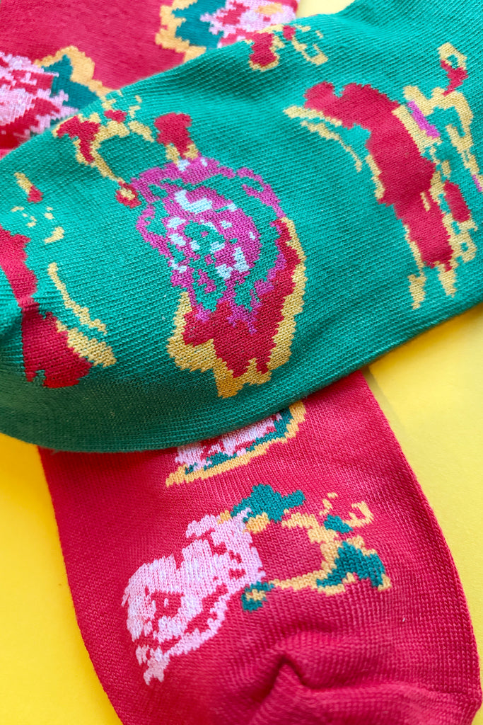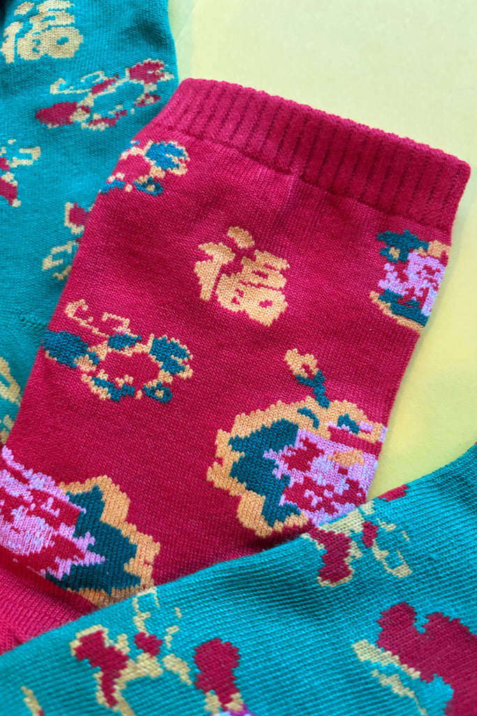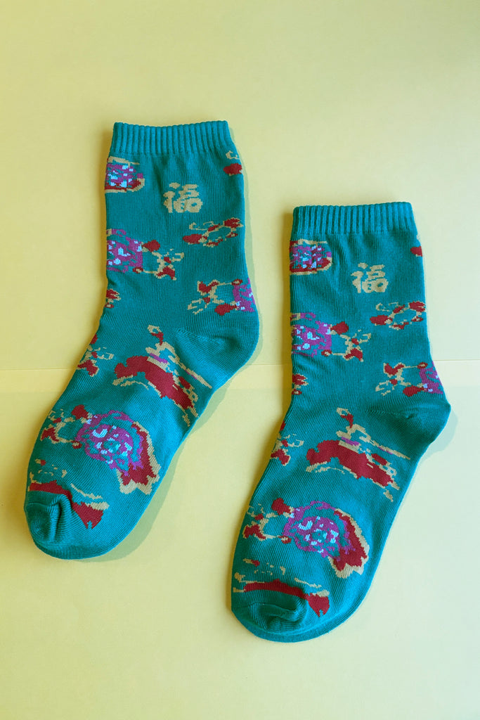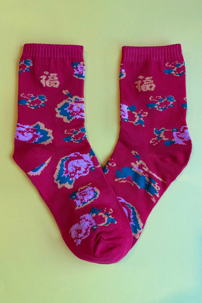 伝統的で色鮮やかな東洋の花柄をあしらい、履き口には「福」の文字を添えました。